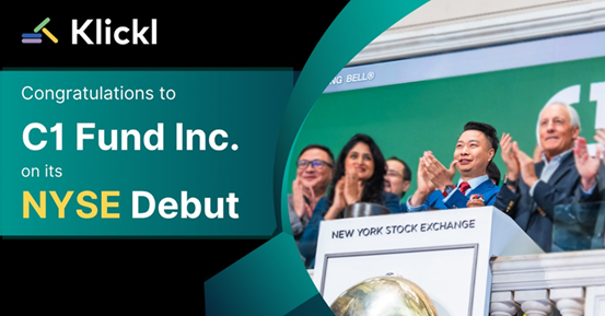نيويورك – (ARAB NEWSWIRE) أُدرج اليوم صندوق C1 Fund Inc. (NYSE: CFND) في بورصة نيويورك، حيث قام مايكل تشاو، المؤسس المشارك والرئيس التنفيذي لشركة Klickl، بقرع جرس الافتتاح، مما يشكل خطوة هامة نحو تعميم الاستثمارات في الأصول الرقمية المنظمة.