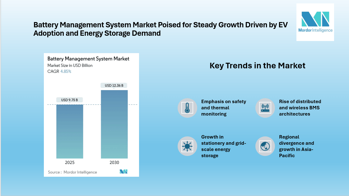 Global Battery Management System Market is anticipated to expand from an estimated USD 9.75 billion in 2025 to approximately USD 12.36 billion by 2030, reflecting a compound annual growth rate (CAGR) of about 4.85 %. This growth is underpinned by rising demand from electric vehicles (EVs), energy storage systems, and more stringent safety and performance requirements for battery packs across sectors. With Asia-Pacific set to remain the largest regional market and emerging regions catching up, the market landscape is shifting toward more modular, connected, and safe BMS solutions.