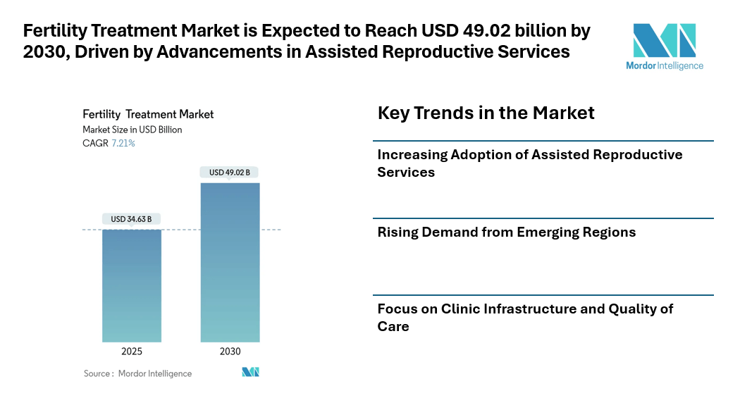 The fertility treatment market continues to gain attention as rising infertility rates, increased treatment awareness, and wider availability of assisted reproductive services support long-term market expansion. According to the Mordor Intelligence study, The fertility treatment market size is valued at USD 34.63 billion in 2025 and is forecast to reach USD 49.02 billion by 2030, advancing at a 7.21% CAGR, reflecting consistent demand growth across clinics, hospitals, and specialized reproductive centers.