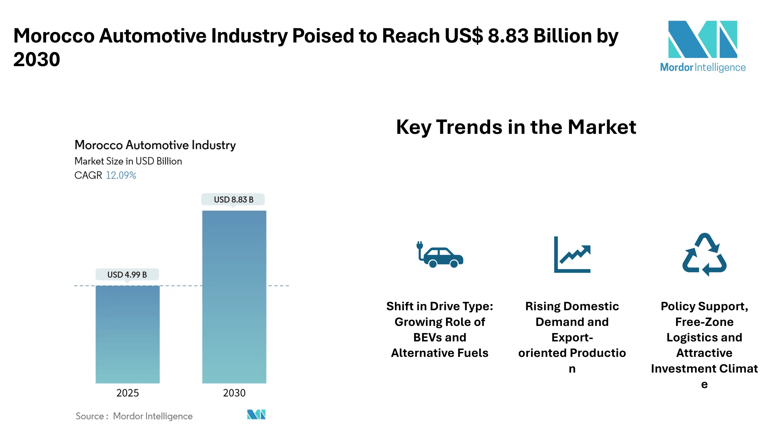 The Morocco automotive market is valued at USD 4.99 billion in 2025 and is on track to reach USD 8.83 billion by 2030, reflecting a 12.09% CAGR over the forecast window. The growth comes as Morocco deepens its ties to global automotive supply chains and continues to expand vehicle production capacity, strengthening its position as a key automotive hub in Africa and beyond. The steady demand for passenger vehicles, rising interest in electric and alternative-fuel vehicles, and favourable government policies all contribute to a dynamic outlook for the morocco automotive industry.