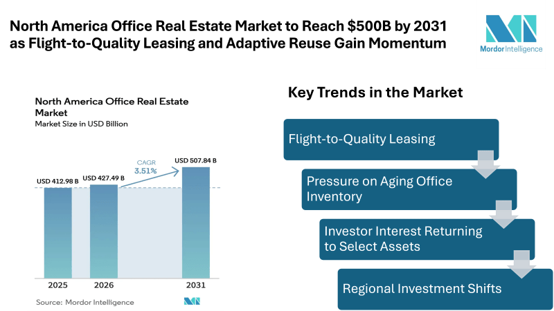 According to Mordor Intelligence, the North America office real estate market size is estimated at USD 427.49 billion in 2026, increasing from USD 412.98 billion in 2025, and projected to reach USD 507.84 billion by 2031, expanding at a CAGR of 3.51% during the forecast period. This outlook reflects both recovery and structural change within the industry, where companies are reassessing workspace strategies while property owners modernize portfolios.