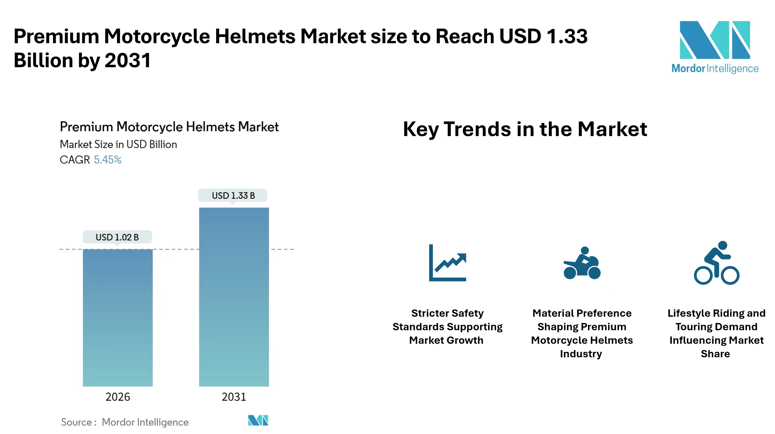 According to Mordor Intelligence, the premium motorcycle helmets market size was valued at USD 1.02 billion in 2026 and is forecast to reach USD 1.33 billion by 2031, reflecting consistent demand across commuter, touring, and performance riding categories. This premium motorcycle helmets market forecast is supported by stricter safety rules, growing motorcycle ownership in developing regions, and wider acceptance of helmets as long-term protective gear rather than a basic legal requirement.